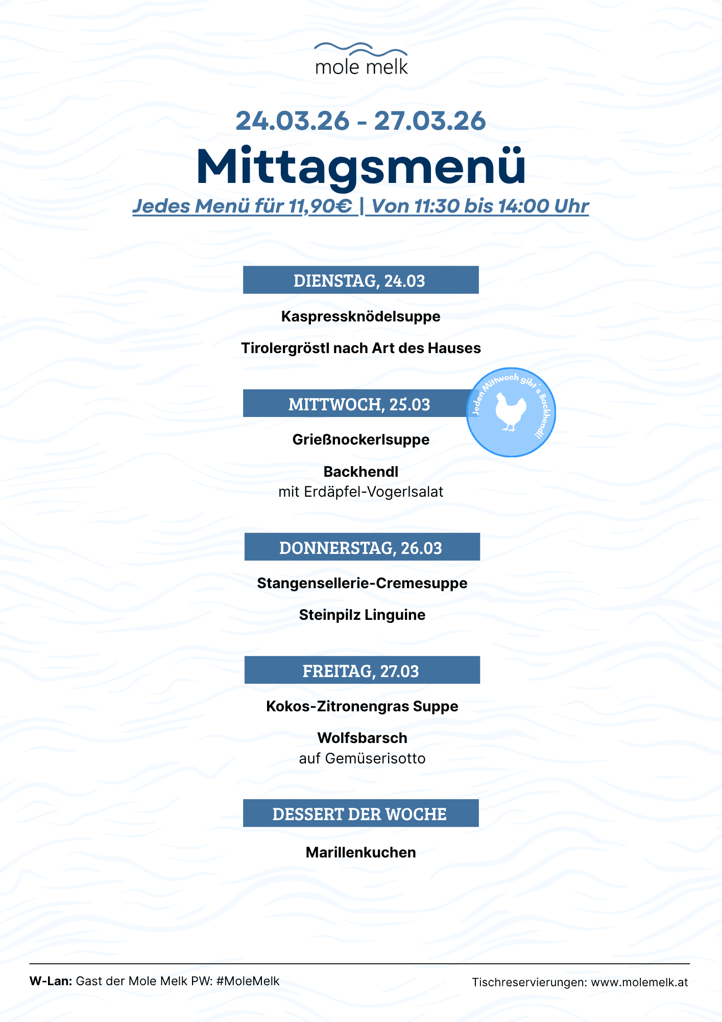 Jede Woche gibts von Dienstag bis Freitag in der Mole Melk das Mittagsmenü.