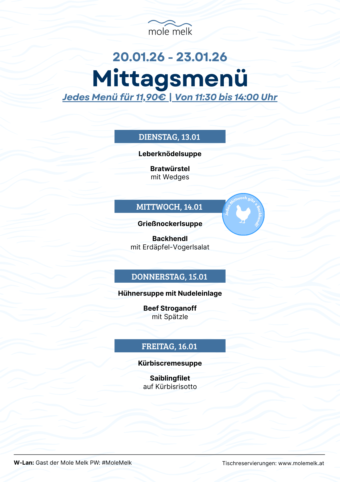 Jede Woche gibts von Dienstag bis Freitag in der Mole Melk das Mittagsmenü.